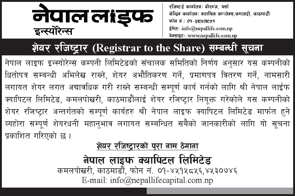 Nepal Life Capital Limited (NLCL) provides Registrar to Share (RTS) and Registrar and Transfer Agent (RTA) services to help issuers manage shareholder records and streamline share-related transactions in compliance with SEBON guidelines.